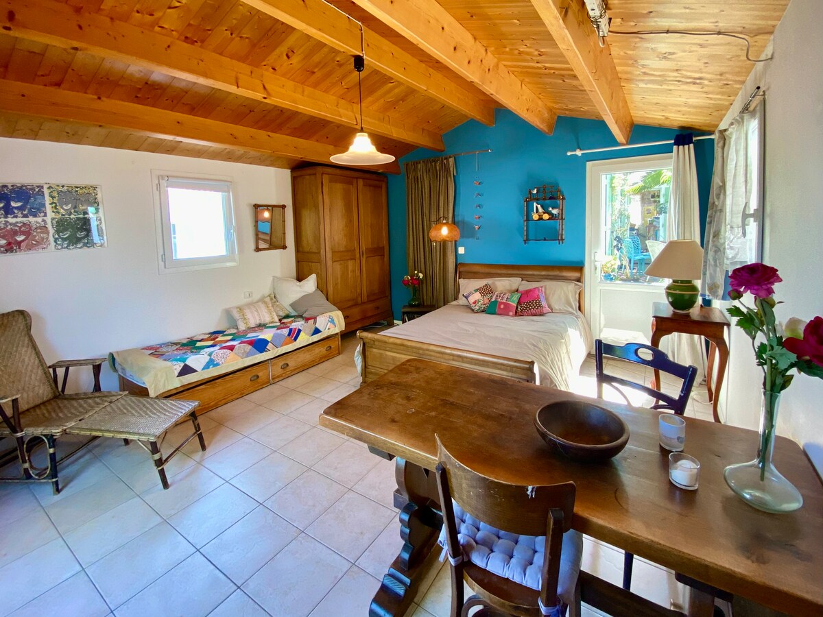 Un protocole de désinfection "Spécial COVID" est en place. Chambre d'hôtes située dans une petite maisonnette indépendante bordée par le chemin qui mène à la côte. Cette chambre dispose d'un espace extérieur et d'un salon de jardin. Nous venons vous accueillir au bateau et transportons vos bagages jusqu'à la chambre à l'aller et au retour. Possibilité de louer sur place des vélos électriques. Les petits déjeuner sont compris. Une séance de spa est offerte pour tout séjour d'au moins 2 nuits.