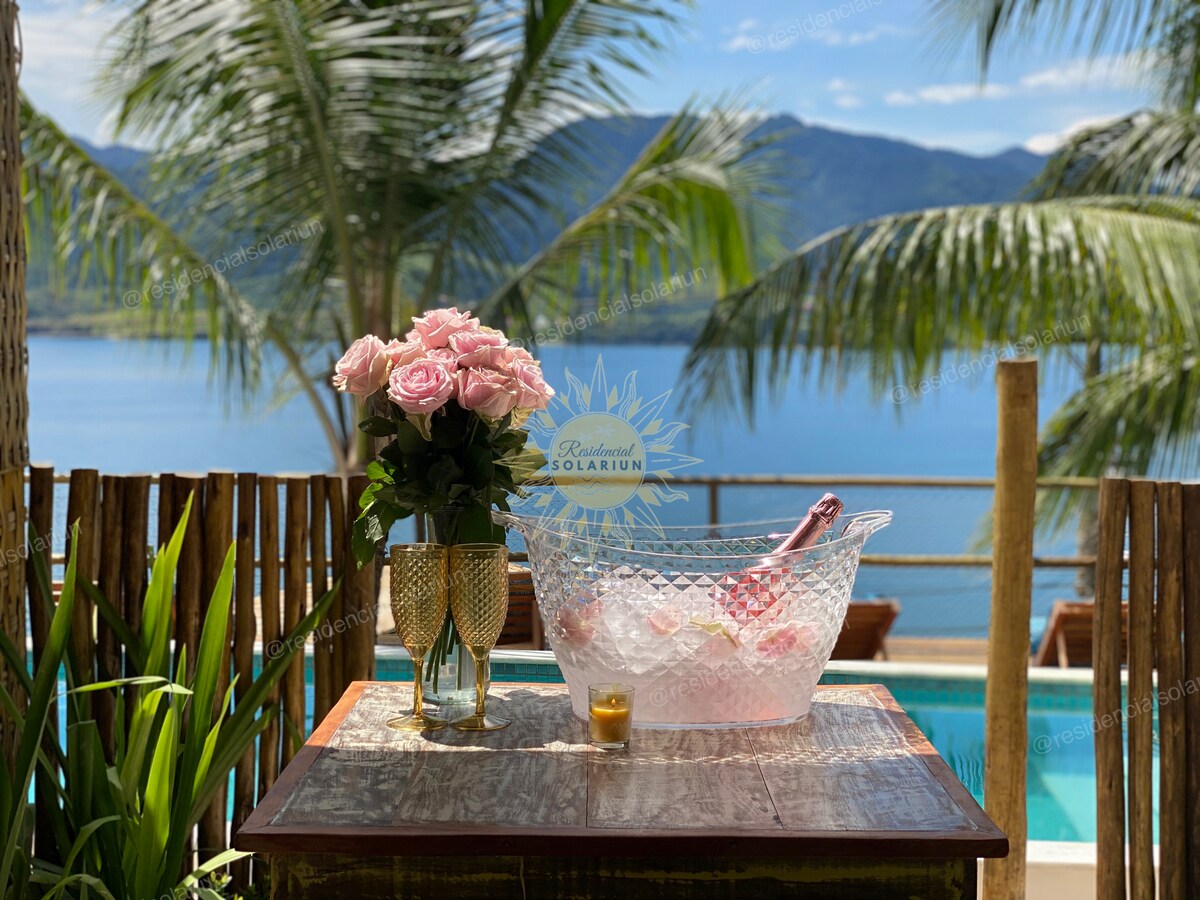 Kom og opplev den mest fantastiske og vidunderlige utsikten over Ilhabela på et eksklusivt sted for deg, familie og venner, tre private suiter med queen size-seng med individuelle fjærer, Split Inverter-klimaanlegg, Smart TV, fiberoptisk internett med 200 mega, planlagte møbler, privat bad, privat gourmetterrasse med minibar og elektrisk komfyr med to plater, servise, bestikk og redskaper for to personer. Svømmebasseng med uendelig kant.