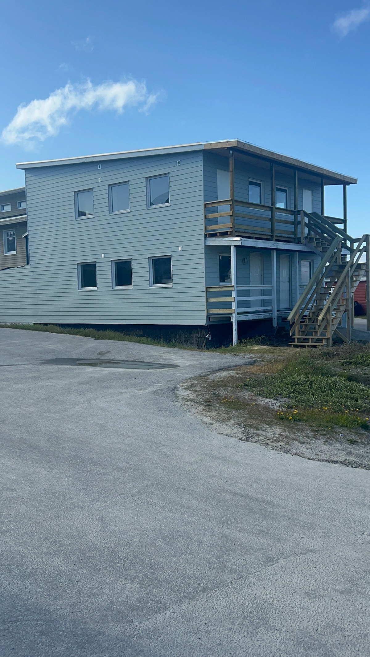 Autentisk grønlandsk dobbelthus, med loft. 35 m2 vestvendt terrasse med kveldssol og spektakulær havutsikt til diskobuktens isfjell og Diskoøya. Mulighet for hval. Huset ligger høyt i et rolig husområde i enden av en liten lukket vei. Kort spasertur til shopping i sentrum (dagligvarebutikk og to supermarkeder), restauranter, i nærheten av «Gul Vandrerute» til Isfjorden. Overnattingsstedet passer for tre personer, men kan brukes av fire, ingen barn under åtte år (én dobbeltseng, én sovesofa og to madrasser (køyeseng).