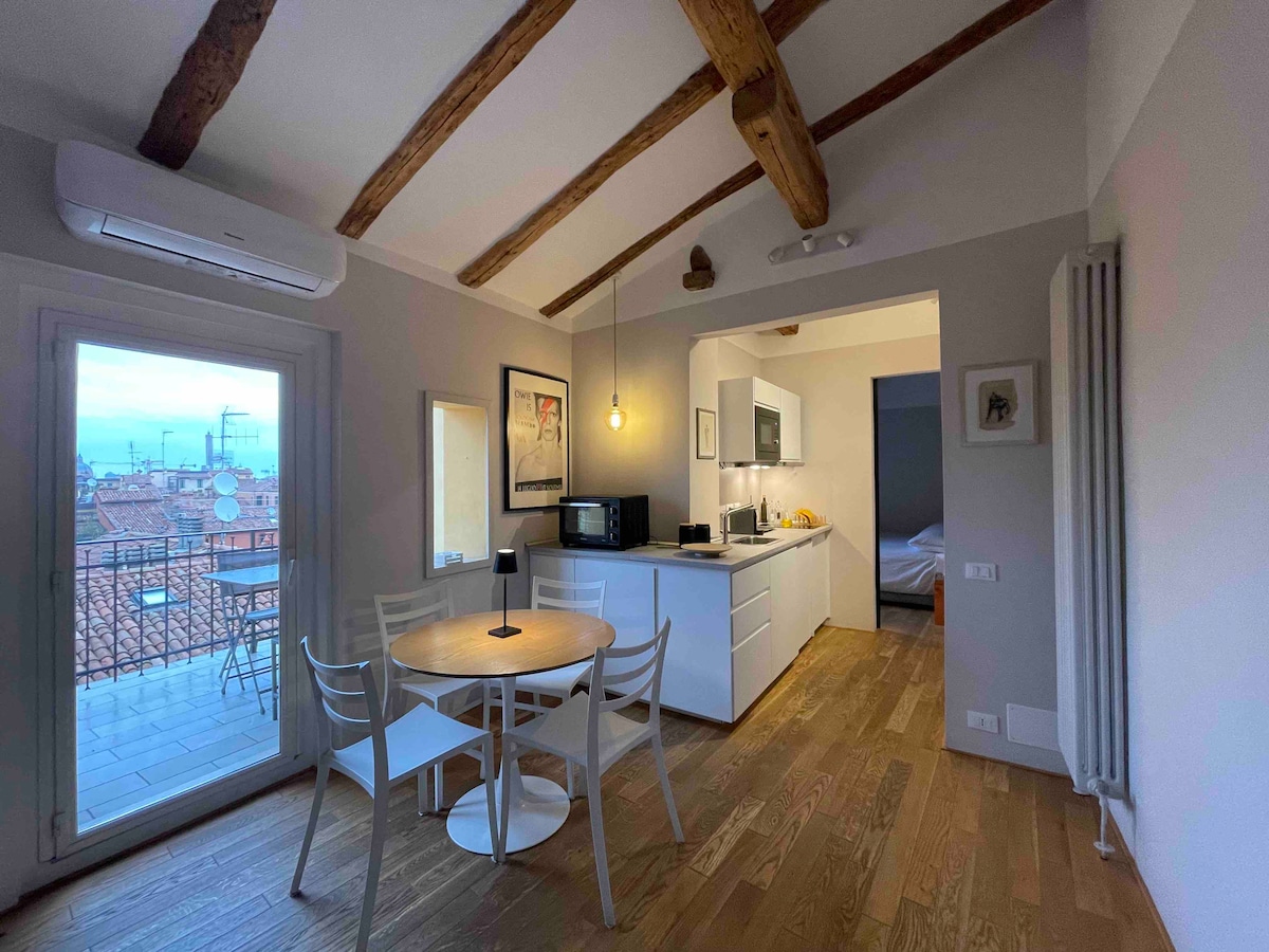 Nyrenovert leilighet i sentrum, et steinkast fra Piazza Maggiore. Leiligheten er på to nivåer og består av to soverom med egne bad, stue med kjøkken i underetasjen, to terrasser (en per etasje), en hems og et vaskerom. Leiligheten er utstyrt med alle fasiliteter og har en overdekket parkeringsplass i bygningen. Fra leiligheten kan du beundre en fantastisk utsikt over Bolonias hustak, inkludert Torre degli Asinelli og San Petronio, samt åsene rundt Bologna.