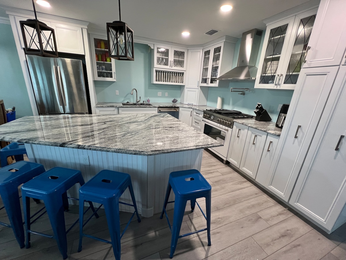 STRANDUTSTYR/UTSTYR INKLUDERT â stoler, boogie boards, sandleker osv. Dette er et hjem med tre soverom og to bad med Ă„pen planlĂžsning, som ligger rett ved stranden. Helt renovert ned til bjelkene, dette hjemmet fĂžles helt nytt, med komfortable mĂžbler og uendelig utsikt mot stranden. Med et hovedsoverom som viser en kingsize-seng, et andre soverom med en queensize-seng og et tredje soverom med full kĂžyeseng over queen-size-seng og har til og med en full trundle under.