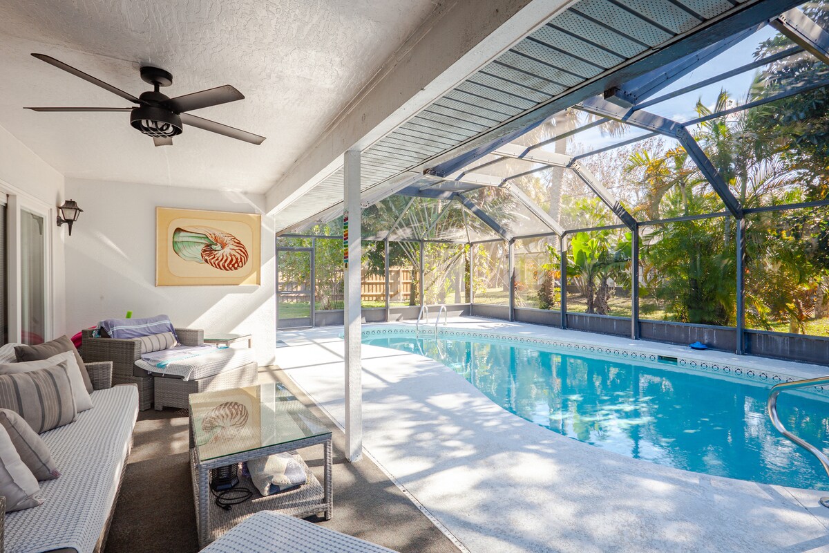Sandalwood Bungalow - oppvarmet basseng og boblebad. - Øst for A1A, mindre enn ett minutts gange til en hundevennlig privat strand på en privat vei. - 50 Amp 240V nivå 2 EV lader for Tesla / elektriske kjøretøy - raskt trådløst nettverk på 800 Mbps. - arbeidsstasjon for kontorområde - uteservering - svingesett - strandstoler, paraply, Boogie Boards. - gitar og piano - gassgrill utendørs. - Oppvarmet utendørs dusj. - bålplass. - Sonos