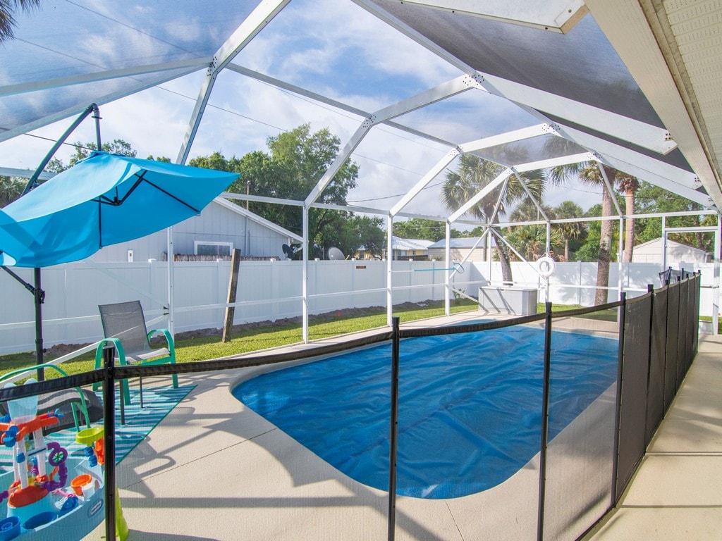 ~Tropical 3Br/2Ba~Heated/Cooled Pool Home Located just minutes from the Indian River, Sebastian Inlet, boat launches, beaches, restaurants, tiki bars, shopping, and skydiving! The home features a resort style outdoor space with pool, pergola, bar and grill area, putting green, and a large open space for games. Newly furnished with 2 king beds/1 queen/1 futon couch. We offer a fully equipped kitchen with coffee bar and starter basket. Don't forget the boat; secured boat parking on property!