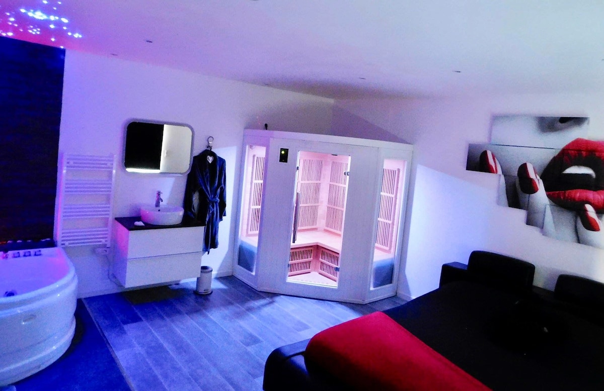 Appartement Glamour’ vous aurez une chambre ouverte sur l'espace bien-être,situé à ingersheim dans une jolie maison viticole à 3 km de Colmar. La chambre est équipée d'un Sauna infrarouge Design, une Baignoire balnéothérapie pour 2 personnes, ainsi qu'un Grand Ecran et un lit 160/200.Décoration Romantique.Bougies lumineuses, pétales.Un ciel étoilé pour avoir la tête dans les étoiles.Des ambiances lumineuses selon vos désirs. Une cuisine toute équipée