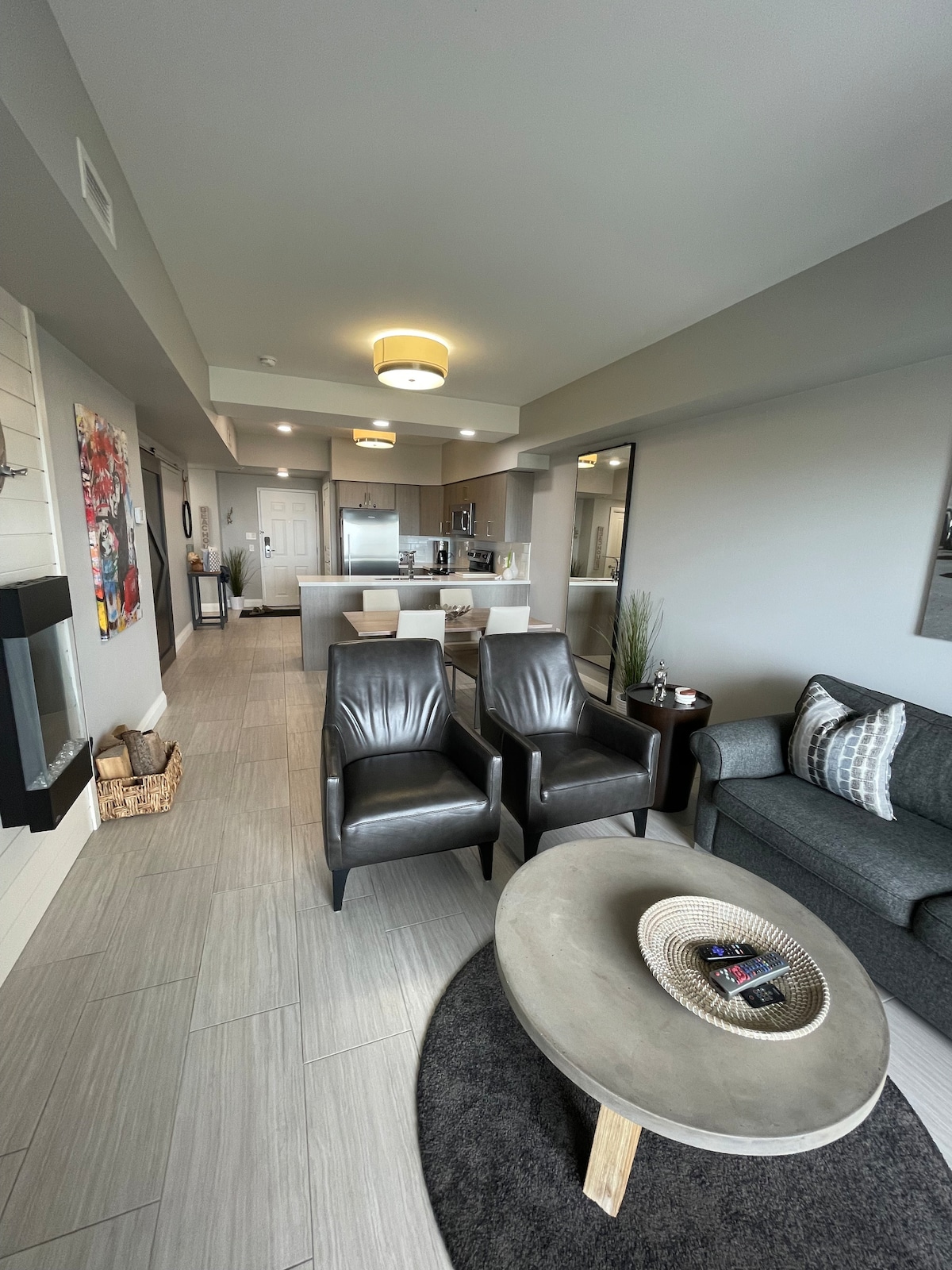 Leiligheten vår på 450 kvadratfot ligger i øverste etasje, med utsikt over sentrum, og ligger noen skritt unna hjertet av Stratford sentrum og alt det har å tilby, inkludert koselige kaffebarer, elegante restauranter, Avon Theatre, i nærheten av den berømte Stratford-festivalen, og andre butikker for alle å nyte. Perfekt for en utflukt for et par eller for å nyte som venner som reiser sammen. Leiligheten vår tilbyr alle nødvendigheter, inkludert en luksuriøs queensize-seng, fullt utstyrt kjøkken, en 55 tommers smart-TV og vaskerom.