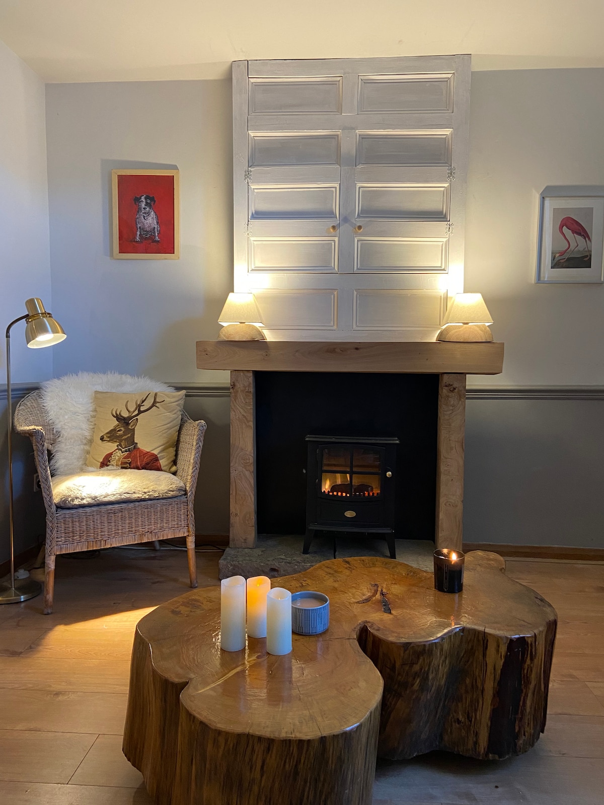 Koselig hytte fra 1700-tallet, åpen ild og kingsize-seng.