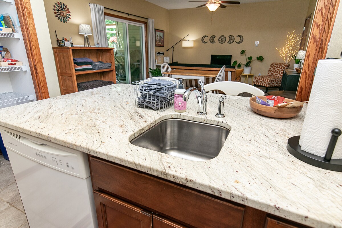 Denne leiligheten har over 111 kvadratmeter boareal. Nyt et fullt kjøkken med benkeplater i granitt, full stekeovn, fullt kjøleskap, oppvaskmaskin og mikrobølgeovn. Tilbring tid på å spille pingpong med familie eller nyt popcorn og en film. Beliggenheten ligger i et rolig og trygt nabolag ca. 20 minutter fra sentrum av Des Moines. Enten du planlegger en ferie med familie eller venner, eller en avslappende tid alene, ønsker vi at hjemmet vårt skal være din oase.