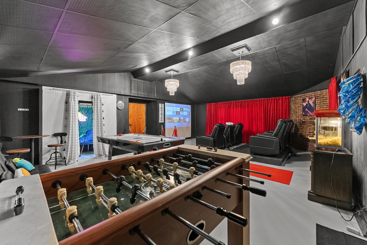 Vårt unike tilfluktssted ligger i kort avstand fra innsjøen og blander avslapning og moro! Slapp av i boblebadet, sov komfortabelt i en kingsize-seng og oppdag et hemmelig filmteater med et hockeybord, en snacksstasjon og en fotobås. Perfekt for venner, par eller familier som leter etter en leken ferie, spillkvelder, filmmaratoner og spaserturer ved innsjøen. Med koselig interiør og underholdning rundt hvert hjørne er dette tilfluktsstedet en unik opplevelse nær vannet.