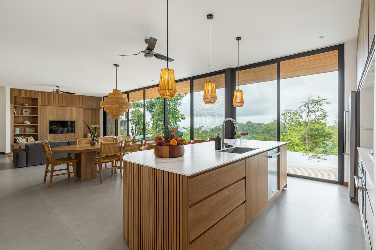 FJELLHUSET HAR ET HJEM i moderne stil med UTSØKT UTSIKT over STILLEHAVET. Dette toetasjes huset ligger på en 3 hektar stor åsside omgitt av jungelen, noe som gir en veldig PRIVAT og ROLIG bakgrunn for din tropiske ferie. Med vakre innendørs/utendørs designelementer og bare noen skritt fra EVIGHETSBASSENGET, har huset et romslig kjøkken, spiseplass, stue og bad på første etasje og TO hovedsuiter med eget bad og en balkong i andre etasje.