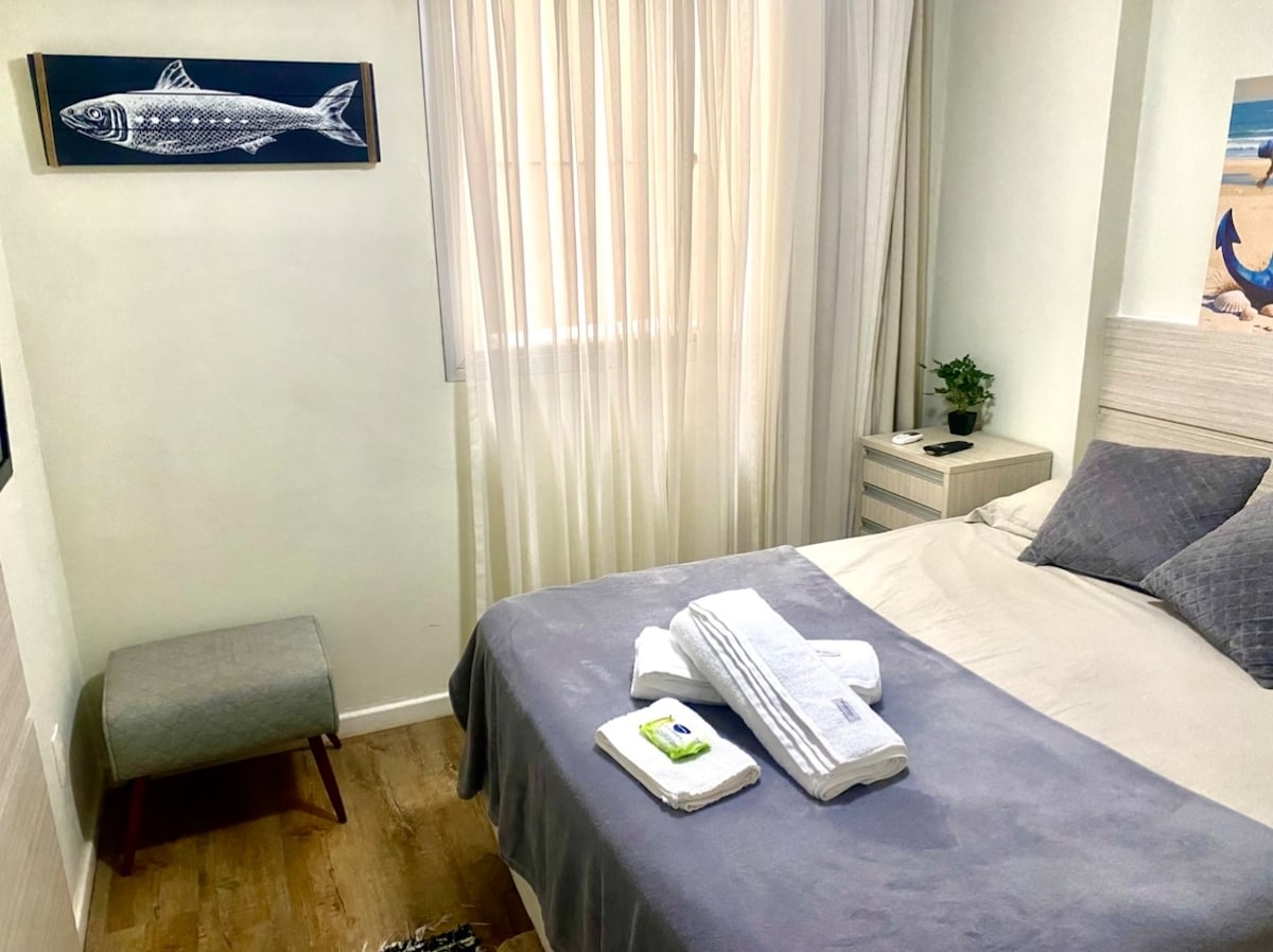 Leiligheten vår består av: * Komfortabel stue, TV med kanalpakke og aircondition. * Ett soverom med luft, dobbeltseng og ekstra dobbeltmadrass, sengetøy og puter. * Kjøkkenet er komplett med mikrobølgeovn, kaffemaskin, elektrisk vannkoker, servise og panner. *Bad med håndklær for gjestenes komfort. * Uteområde med felles grill og barneområde. MERK: For å få tilgang til leiligheten er det nødvendig å gå i trapper. VI TILBYR IKKE PARKERINGSPLASS.