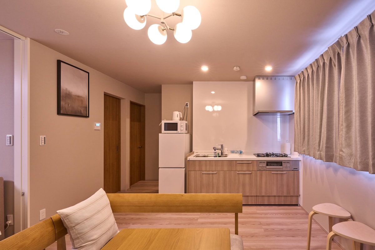 Nybygd leilighet med to soverom i sentrum av Kutchan, syv minutters gange fra JR Kutchan stasjon. HANAZONO Resort ligger ti minutter unna med bil, og Grand Hirafu ligger omtrent 13 minutter unna. Perfekt for 3–4 venner, par eller familier som besøker Niseko. Leiligheten har en romslig stue, utstyrt kjøkken, skilagring og raskt trådløst nettverk for å slappe av etter en dag i bakken. Det ligger restauranter, kaféer og et stort supermarked innenfor gangavstand. Nyt lokal mat og opplev Niseko som en lokal innbygger.