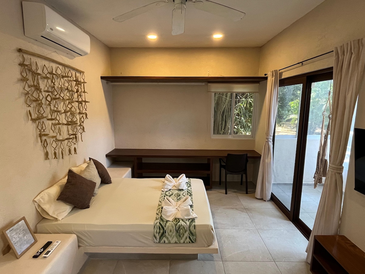 Kom og slapp av i en studioleilighet, hvor du vil ha et kjøkken, kingsize-seng, komplett bad, skap og en utrolig terrasse med utsikt over Zihuatanejobukten. Du vil også være i kontakt med naturen rundt eiendommen.