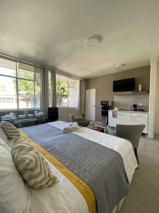 Nyt de vakre solnedgangene i Guadalajara i en av de sikreste, best tilkoblede og mest gastronomiske koloniene i byen. Dette moderne, dyrevennlige studioet er tilpasset for korte eller lange opphold. Den har en ekstraordinær terrasse for å ta imot gjestene dine. Det er en hel leilighet med en queen size-seng, spisestue, integrert kjøkken, privat terrasse, vaskemaskin, strykejern, TV, internett (100 mb) og safe. Den ligger i tredje etasje og det er ingen heis.