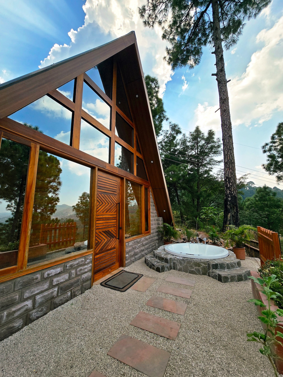 Velkommen til Pine Noir Cabin, et unikt A-rammeferiested fra Nowhere Cottages i Kasauli. Denne luksuriøse hytta har en fantastisk blanding av takpaneler i furu og eksponerte jernelementer malt i matt svart Duco, noe som skaper et elegant, helt svart interiør. Omgitt av en tett furuskog med fantastisk utsikt over dalen, tilbyr den en uovertruffen utflukt. Oppdag ro og eleganse i Kasaulis første av sin vennlige A-rammehytte, perfekt for en rolig ferie eller et eventyrlig tilfluktssted.