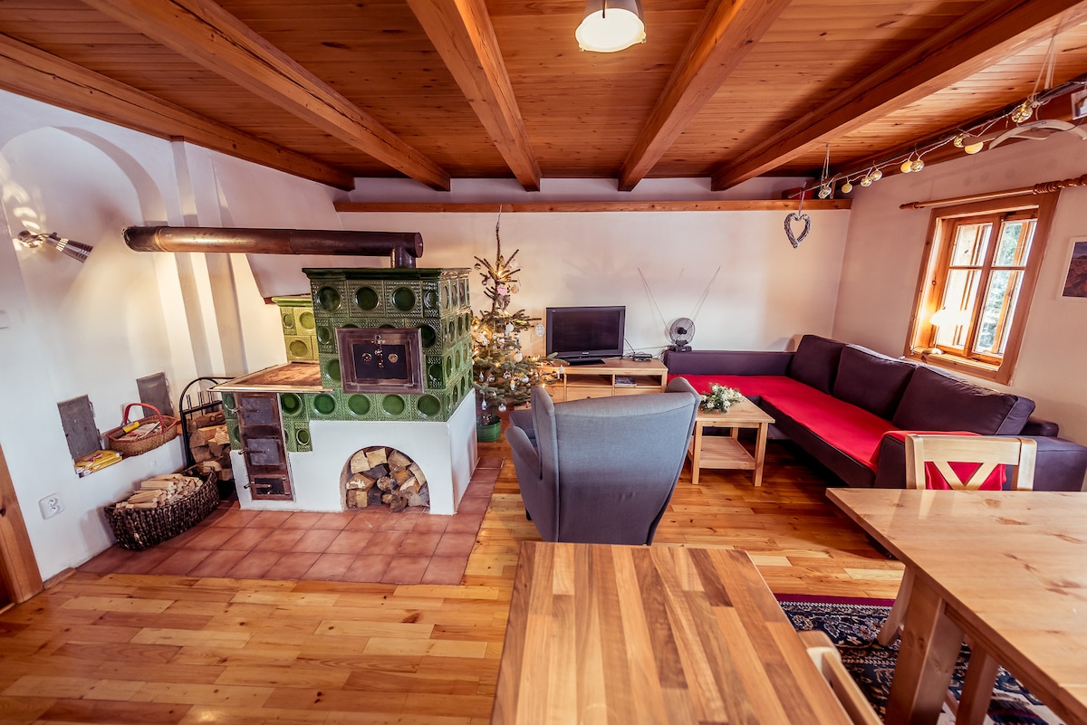 Leiligheten ligger i en renovert villa fra første republikk i utkanten av Jizera-fjellene. Den tilbyr romslig innkvartering for opptil syv personer, ideelt for familier og vennegjenger. Det er tre soverom med fire dobbeltsenger og én enkeltseng. Leiligheten har også en privat badstue, ideell for avslapning etter en dag på fjellet. Det er et moderne kjøkken, bad, TV, videospill, Nintendo, trådløst nettverk, hotelltekstiler og parkering ved bygningen.
