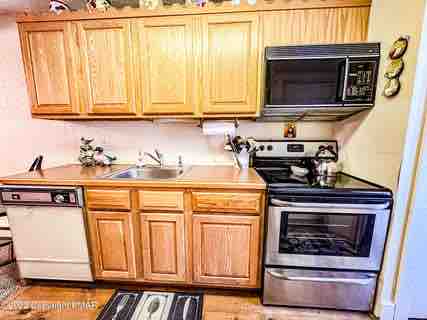 Velkommen til «Bear's Den». Dette tosoveroms-hjemmet tilbyr en romslig stue/spiseplass, en peis, spiseplass med plass til 6 personer og et fullt utstyrt kjøkken. Utedekket har en grill og tilbyr et privat område fylt med et naturlig landskap av vakre trær. Dette supersøte hjemmet har komfortabeltlig plass til syv personer og ligger på Jack Frost-fjellet, hvor du kan gå i løypene helt til skiheisen! Ligger i Lake Harmony, hvor vinter- og sommermoro venter på deg på «Bear's Den».