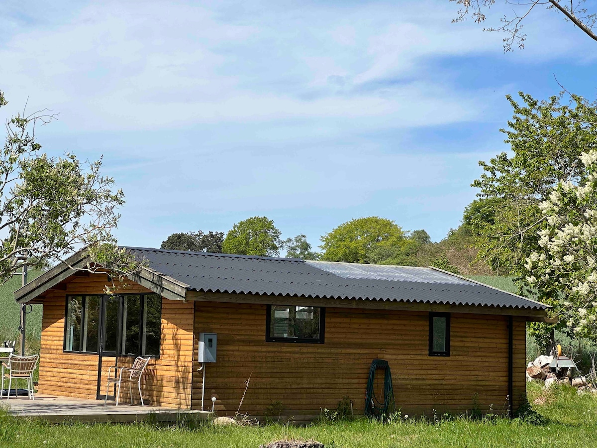 Hyggelig tømmerhytte i grønne, fredelige omgivelser