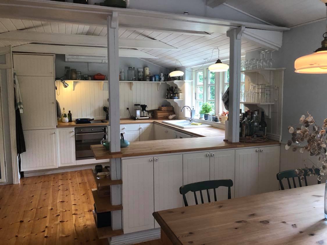Vakkert kjøkken/allrom med fantastisk lys, både på grunn av takvinduer og stor vindusparti mot terrassen og hagen. Kjøkkenet har en kokeplate, vedovn og er i åpen forbindelse med spiseavdelingen, som igjen er delvis er åpen til stuen. 2 rom med stor hems, stort bad med både spa- og dusjbad samt vaskerom med vaskefasiliteter. Det er 1000 m til nærmeste strand og 2 km til nærmeste innkjøpsmuligheter.