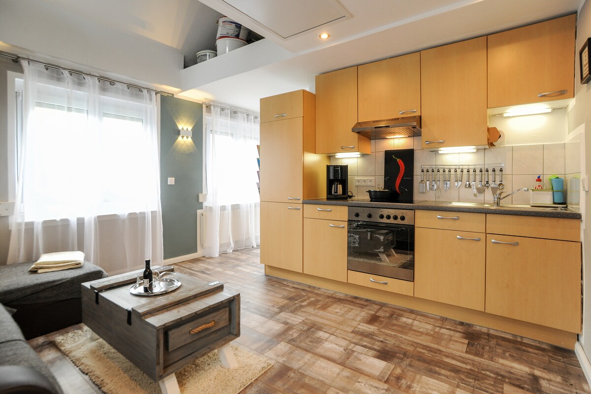 Koselig mikroleilighet for tre i gjestehuset vårt (Pension Jasmin) med: bad, kjøkkenkrok og kjøleskap på rommet. Vår første og totalrenoverte Pension Jasmin har komfortable senger, flatskjerm-TV, kjøleskap, skap og gratis trådløst nettverk. Det nye, moderne utstyret og den vellykkede utformingen av lokalene våre sikrer rolig søvn og god hvile.
