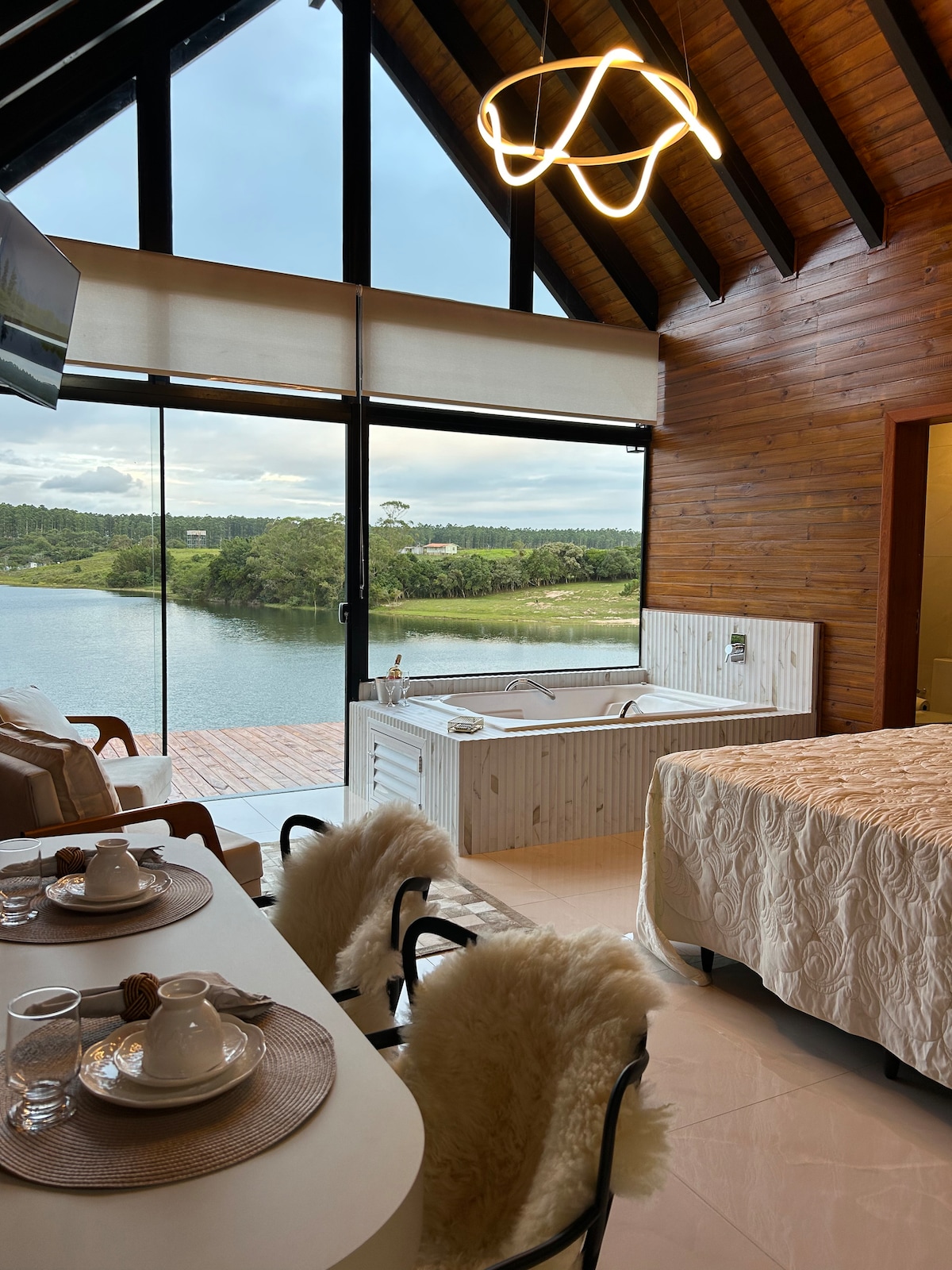 Cabana Recanto da Lagoa - Tranquilidade e Conexão com a Natureza! Med privat lagune, badekar, 2,5 km fra Campo Bom-stranden, med rampe for å gå ned med jetski. Den eneste lagunehytta. 📍 Beliggenhet: I sjarmerende Lagoa do Campo, i Jaguaruna/SC, bare 2,5 km fra stranden. Frokost er ikke inkludert. Den har minibar, induksjonskomfyr, mikrobølgeovn, elektrisk vannkoker, sandwichmaskin, mikrobølgeovn og redskaper generelt… 1 seng, TV og aircondition.