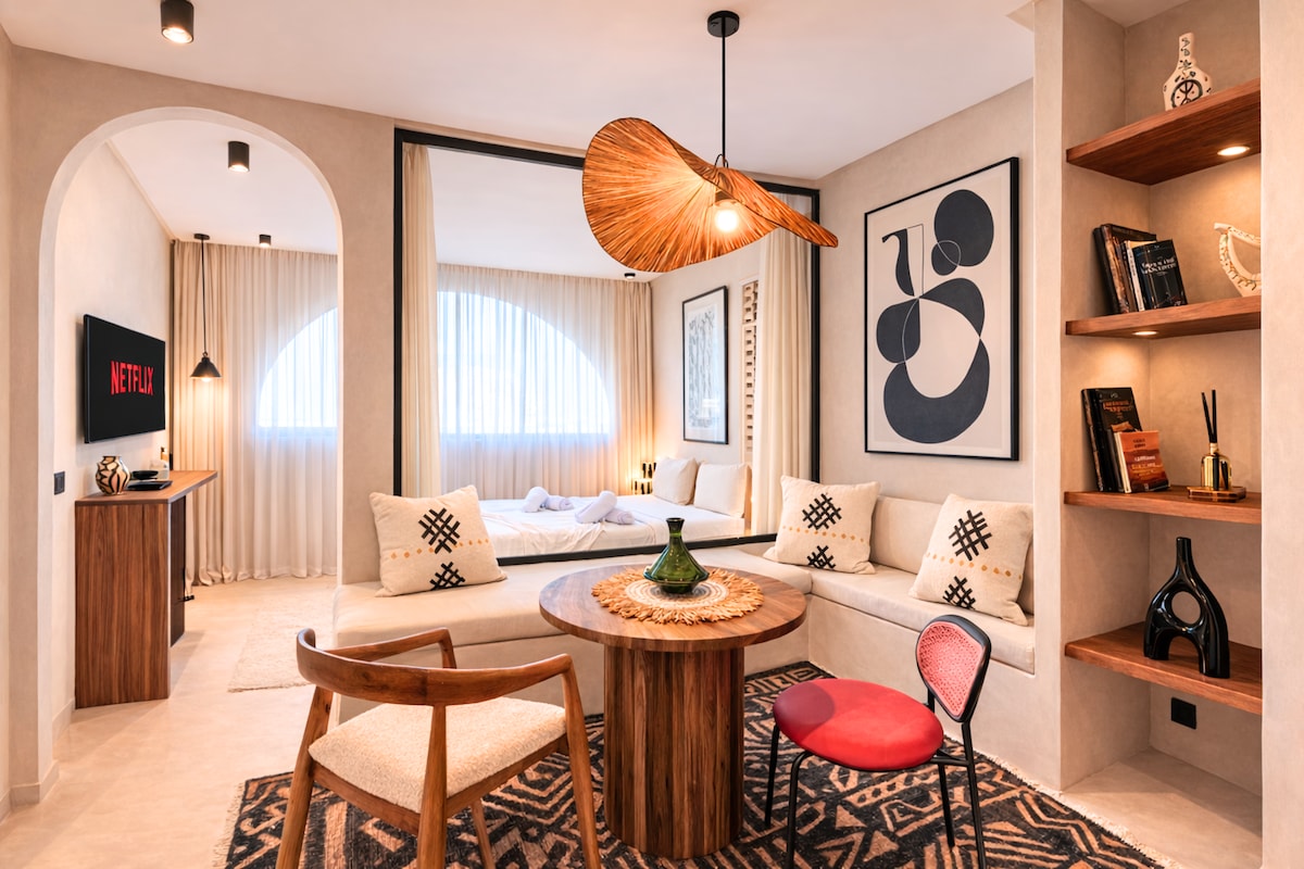 •Majorelle og YSL Street Hideaway Beliggende på den ikoniske Yves Saint Laurent-gaten, bare noen skritt fra den verdensberømte Majorelle-hagen og Yves Saint Laurent-museet, en førsteklasses beliggenhet for å utforske Marrakech enkelt, enten du går eller kjører. Nyt en nøye designet leilighet med ett soverom, i en sikret og trygg bolig døgnet rundt med basseng for de varme dagene, en liten og smart utforming, med en gjennomført design for å gjøre oppholdet ditt smidig og avslappende.