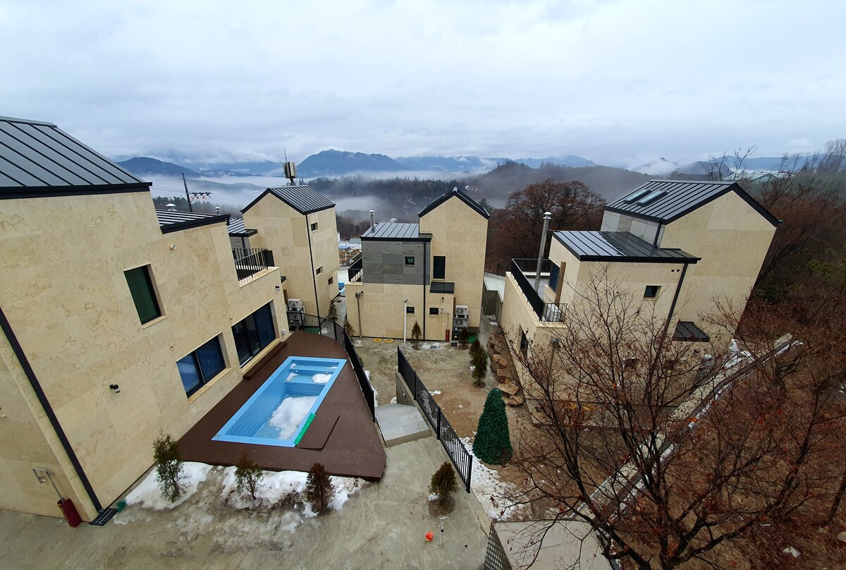 Et overnattingssted omgitt av en furuskog full av fytoncider, med grønne, naturlige blomster hele året og et trivelig interiør. Dette er en sjelden hytte bygget med miljøvennlige materialer og kanadiske furutrær uten bruk av innendørs og utendørs sement for dine kjære. Den velbygde hytta er varm om vinteren og kjølig om sommeren, perfekt for en ferie. Dette er et privat overnattingssted hvor du kan tilbringe en perfekt dag for deg selv, helt uten at andre ser deg, og slappe av til lydene av fjellfugler og vinden som kiler ørene dine. Opplev fullstendig avslapning i stuen og på utestuverommet, og nyt panoramautsikten over Tongpangsan-fjellryggen, som åpner seg mot himmelen og varmer hjertet ditt. På ettermiddagen kan du føle øyeblikkets lykke ved å se på barna som løper og leker på den solfylte plenen. Ved solnedgang bør du huske å beundre den vakre solnedgangen som stiger opp over fjellryggen i det fjerne. Vi inviterer deg til en komfortabel og komfortabel europeisk-inspirert overnatting hvor du kan tilbringe dyrebar tid med din elskede familie og gamle venner.