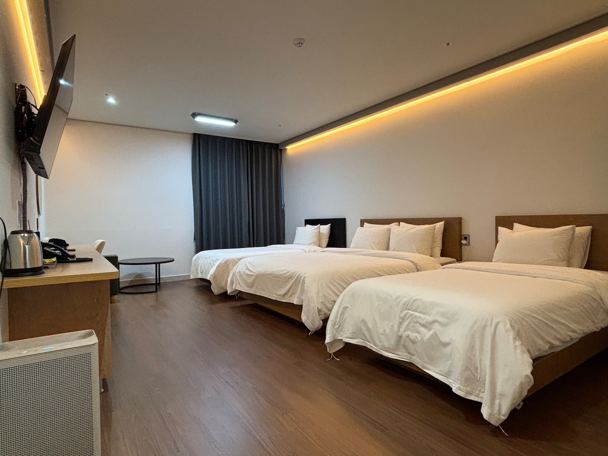 Standardantall: 3 personer/maksimalt antall personer: 4 personer (gratis) Innsjekking: 15:00/Utsjekking: 11:00 (1 queensize-seng + futon- og sengetøyssett i dobbeltseng) * * * For rabatter og mer informasjon, vennligst søk etter "Lyricistic Hotel Cheongju" i det grønne vinduet. [Romfunksjoner] Trådløst nettverk/klimaanlegg. Oppvarming/bord/sofa/LG Cinebeam/Netflix/queensize-seng/dyne/kjøleskap/Nespresso-kaffemaskin/kapselkaffe/mineralvann/vinåpner/mobiltelefonlader [Baderomsfunksjoner] London Collection Fasiliteter/Petitomas Lotion/såpe/kam/dusjhåndkle/håndklær/kjoler/hårføner [Vennligst merk] Ikke tillatt med kjæledyr. Alle områder på eiendommen er røykfrie - Hvis du røyker, blir du belastet 200 000 won for vedlikehold av rommet. - Røyking på takterrassen Parkering er tilgjengelig for 5 biler på hotellplassen/veiparkeringstid bak hotellplassen (hverdager: 18:00 - 7:00, helger: gratis)/1-dagers parkeringsavgift (8 000 KRW) ved bruk av offentlig transport parkeringsplass i intercity-bussterminalen (kvittering leveres)