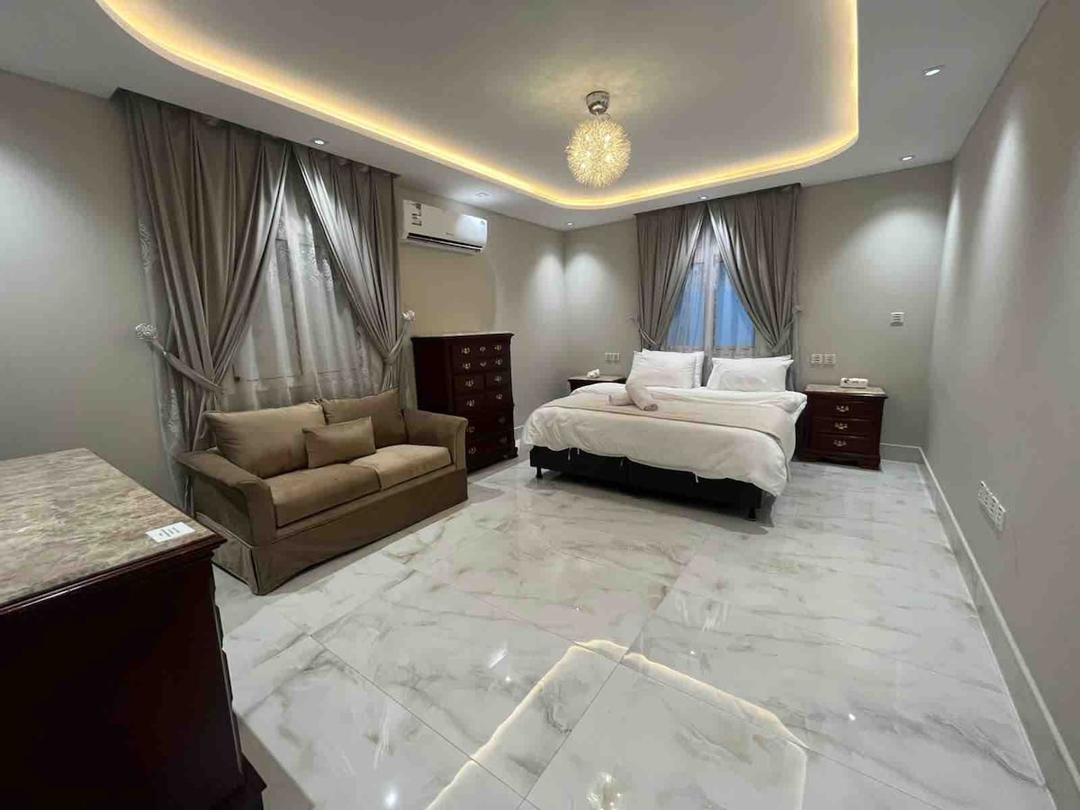 En luksuriøs, rolig og romslig leilighet i et nytt boligbygg. Det er en heis for enkel tilgang til boligen, selvbetjening og høy grad av privatliv. Det er en ansatt tilgjengelig for å betjene gjestene under oppholdet for å levere bestillinger og utføre daglig rengjøring. (Det er høyhastighets Wi-Fi tilgjengelig i boligen) (supermarked, vaskeri) og en privat parkeringsplass for 2 biler Vi har en 65-tommers underholdningsskjerm Med Netflix-abonnement 📺 Se på TV 📽️ I nærheten av Abhar 🌊 10 minutter I nærheten av Jeddah lufthavn ✈️ 15 minutter I nærheten av Al Jawhara stadion 🏟️ 4 minutter I nærheten av Super Dome Jeddah Dome 🎉 6 minutter