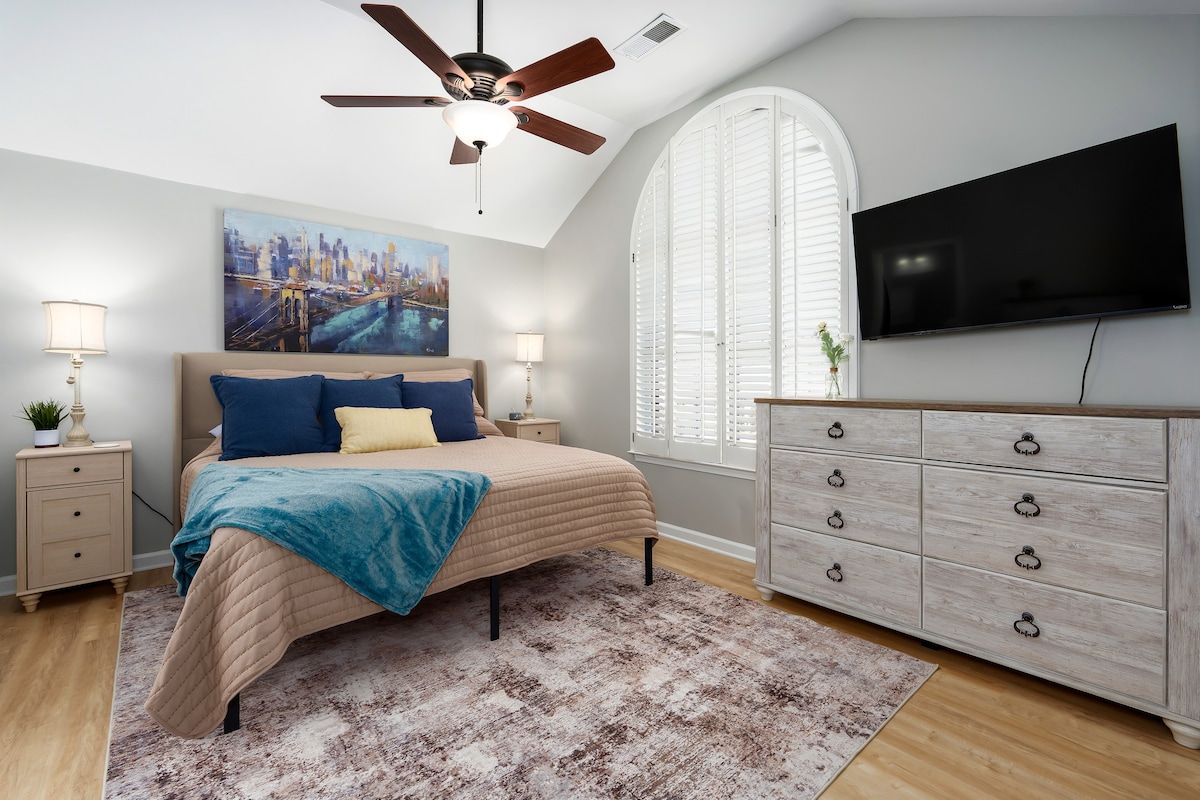 ✨ Nyrenovert rekkehus i Pelham med helt nye møbler! Perfekt for familier med reiseballer, bare fem minutter fra Pelham City Park og ti minutter fra fotturer, sykling og fisking i Oak Mountain State Park. Ovenpå er det et hovedsoverom med kingsize-seng og to soverom med queensize-senger. I hovedetasjen er det et køyesengrom med to enkeltsenger. Kjæledyrvennlig (kun hunder, gebyr på 130 USD). Enkel tilgang til I-65 (sju minutter) og utstyrt med dørklokke og bakgårdskameraer. Din komfortable, praktiske ferie venter!