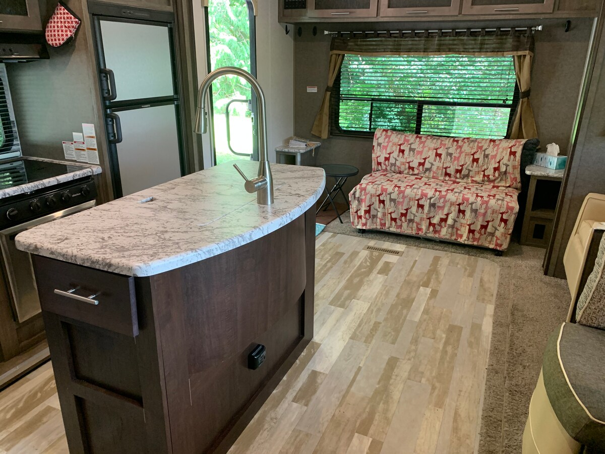 Du kommer aldri til å glemme oppholdet på dette unike bostedet. Vi har en 37 fots romslig campingvogn med ett soverom og fem hjul som har plass til opptil seks gjester. Soverommet har en komfortabel king size-seng, kommode, romslig garderobeskap og 32 tommers TV. Kjøkkenet har komfyr, stekeovn og kjøleskap i full størrelse. Stuen har plass til seks personer, en sofa med massasje og varme. Den er fullt utstyrt som om du var hjemme. Det er ditt hjem hjemmefra. 30 minutter til vakre strender, 0,3 miles til sentrum av Forks.