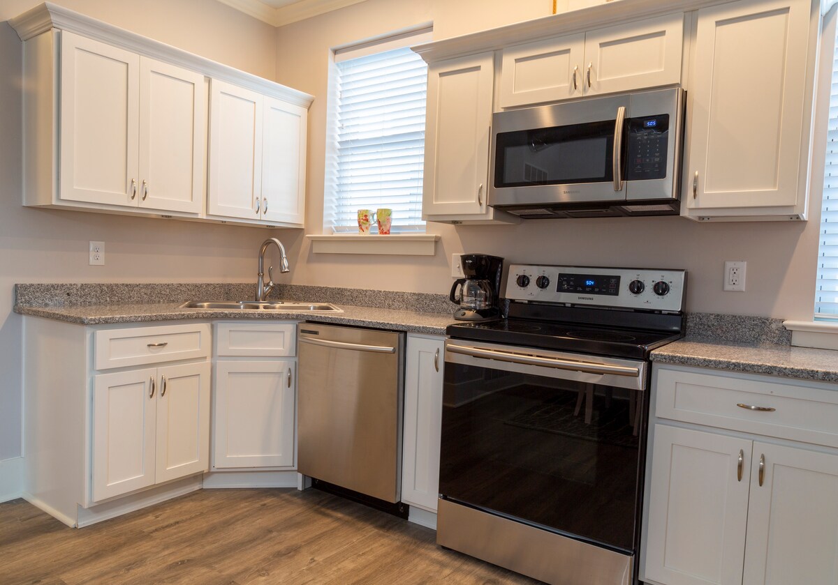 Besøk Jeff & Louisville og bo i dette nyrenoverte hjemmet! 1 seng/1 bad. Inngjerdet i terrasseområdet og privat innkjørsel. Gå til parker, spisesteder og shopping i sentrum av Jeffersonville. Høyt tak, sjarmerende plass, moderne fasiliteter! Nytt profesjonelt kjøkken, spisebord, sitteplasser ved kjøkkenøya, queensize-seng, komfortabel sofa, LUKSURIØST bad med frittstående badekar, dusj og rikelig med sminkeplass! Perfekt for to gjester (og/eller et barn). Vaskemaskin og tørketrommel. Vi bor i nærheten og har et annet Airbnb over gaten!