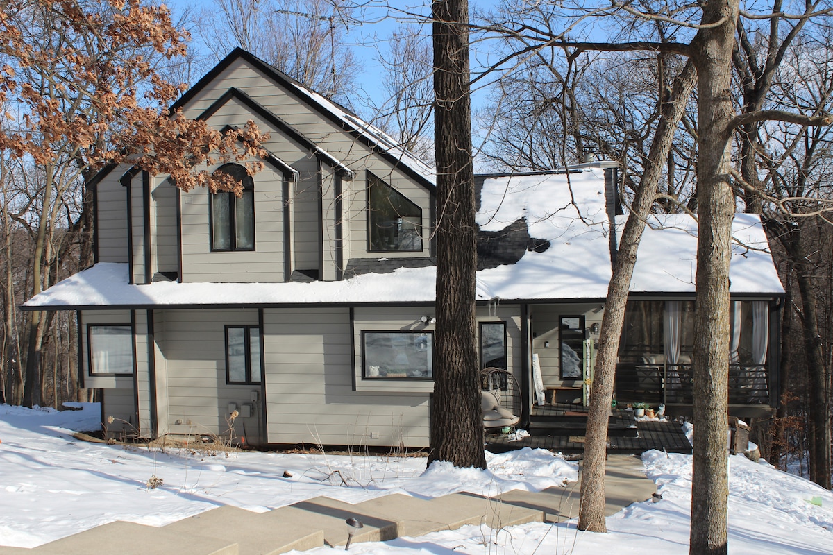 Velkommen til det koselige hjemmet vårt ved innsjøen i East Dubuque, Il, som ligger bare noen minutter fra Galena i Illinois og Dubuque i IA. Dette hjemmet med to soverom har plass til seks personer. Vi tilbyr kanoer og redningsvester. Dette hjemmet har også en stor garasje, en privat terrasse med utsikt over innsjøen og stor hage. Andre fasiliteter inkluderer sentral luft, komfortable madrasser, alle kjøkkenapparater, vaskemaskin/tørketrommel, smart-TV med soundbar og kabelinternett. Ikke gå glipp av å bestille nå.