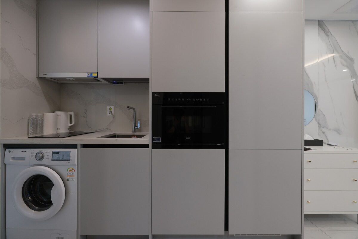 En nybygget bolig innenfor tre minutter fra to T-banestasjoner. * Resepsjon, bagasjeoppbevaring og gjestesalong: B1F (engelsk- og kinesisktalende ansatte tilgjengelig, frokosttjeneste (betalt)). * røykfri eiendom. bot: 150 000 won. * Kaffemaskin og velkomstkaffekapsel, bidé, drikkevannsrenser. *Alt du trenger, akkurat som hjemme. * To gjester bruker én seng. Hvis du foretrekker separate senger, må du be om det på forhånd. (Betalt.) * For tre eller flere personer settes en sovesofa opp som seng.