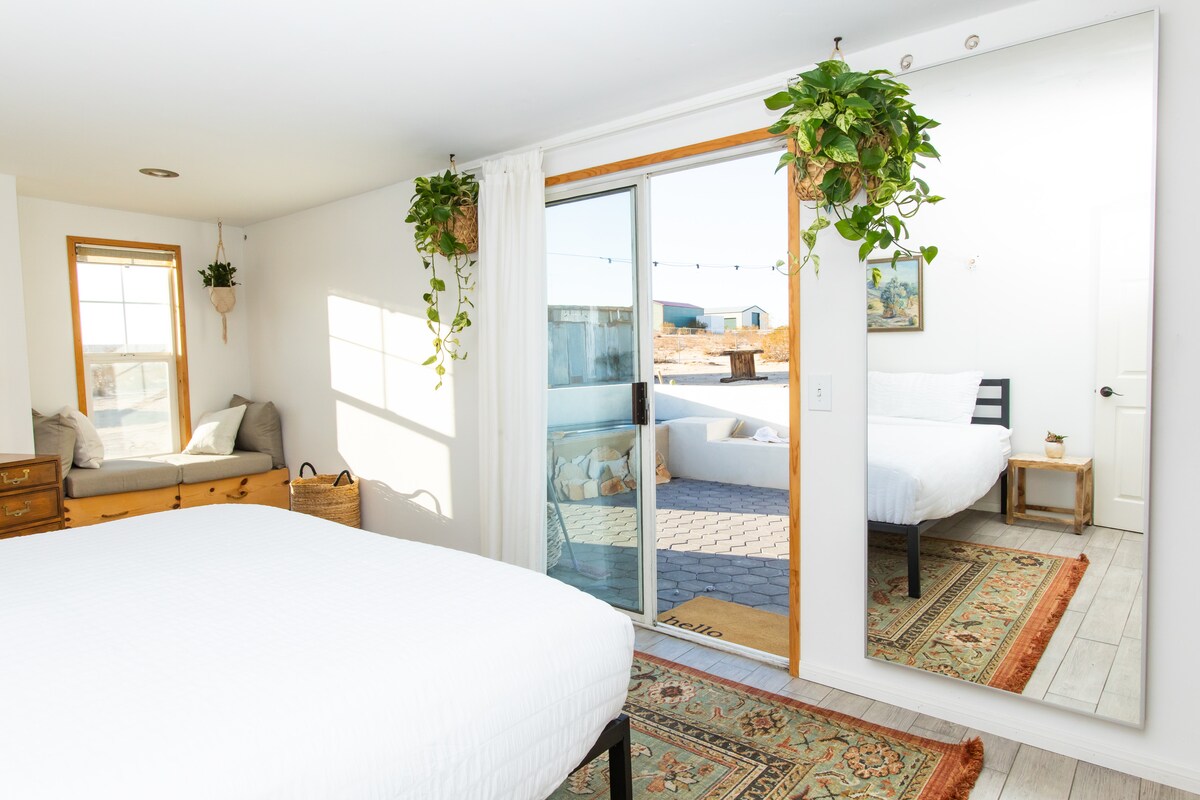 Desert Bliss er et av de mest komfortable, avslappende stedene du finner i Joshua Tree. En hytte i westernstil med to senger, ett bad og moderne fasiliteter, med en valgfri separat 1 seng, 1 bad Vintage 32 fot trailer. Den perfekte baseleiren å utforske JTNP og nærområdet fra. Det handler ikke bare om de komfortable sengene, å drikke en drink på verandaen når solen går opp eller ned, eller varme seg opp i boblebadet, se på stjernene etter å ha vandret i parken. Det er den absolutte freden og roen. Unn dere selv noe godt.