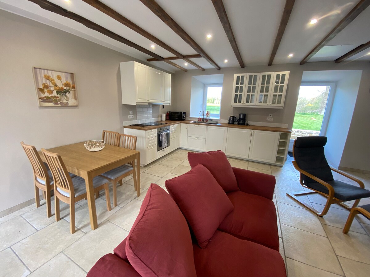 Vakkert renovert, veldig godt utstyrt hytte, med originale funksjoner og vedovn. Flott beliggenhet for å utforske sandstrender og historiske byer, alt innen 20/30 minutters kjøretur. Kort spasertur til Jugon. Begge soverommene ligger på første etasje, noe som gjør det ideelt for alle med bevegelseshemninger.