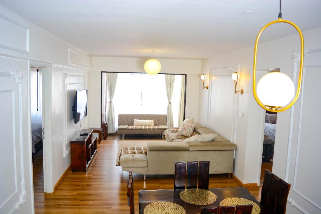 Moderne leilighet med ett soverom og fantastisk utsikt over byen i Kilimani Velkommen til ditt stilige hjem hjemmefra i 16. etasje! Denne nybygde, nydelig møblerte ettromsleiligheten tilbyr en koselig, hjemmekoselig stemning med fantastisk utsikt over byen. Nyt en rolig natt på en komfortabel madrass med rent, hvitt sengetøy, og slapp av med en 55" smart-TV for favorittprogrammene og filmene dine. Start dagen med gratis kaffe, te og sukker, og forfrisk deg med