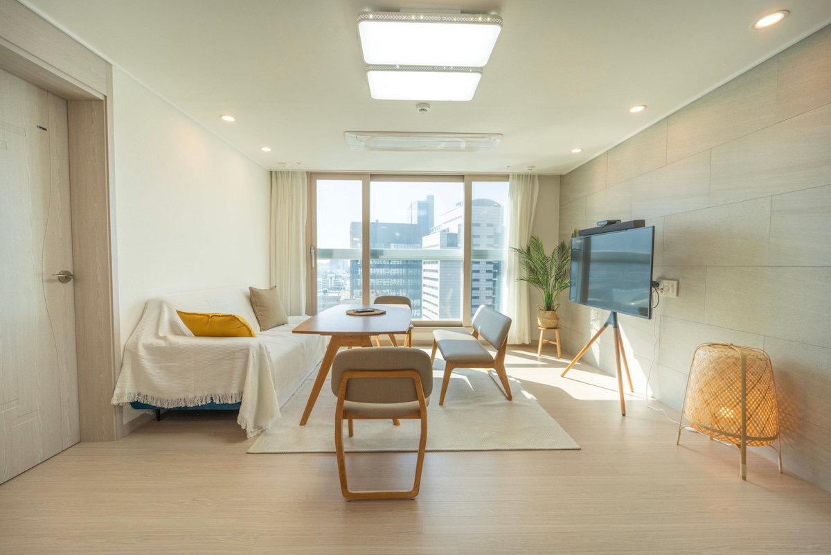 @stay8usanhang er et sted med utsikt over Busan havn, gjennomtenkt designet for å tilby komfort og inspirasjon. Hver detalj, fra musikk og duft til atmosfære, interiør og sengetøy, har blitt nøye utvalgt for å forbedre oppholdet ditt. - Skybro koblet til Busan stasjon (fem minutters gange). -1 Super kingsize-seng, 3 superenkelsenger. Badekar med havutsikt (klar for spa) - Fullt utstyrt / ideelt for familiereisende 50-tommers stor TV med Netflix, YouTube, OTT og kringkastingskanaler Bang & Olufsen-høyttalere