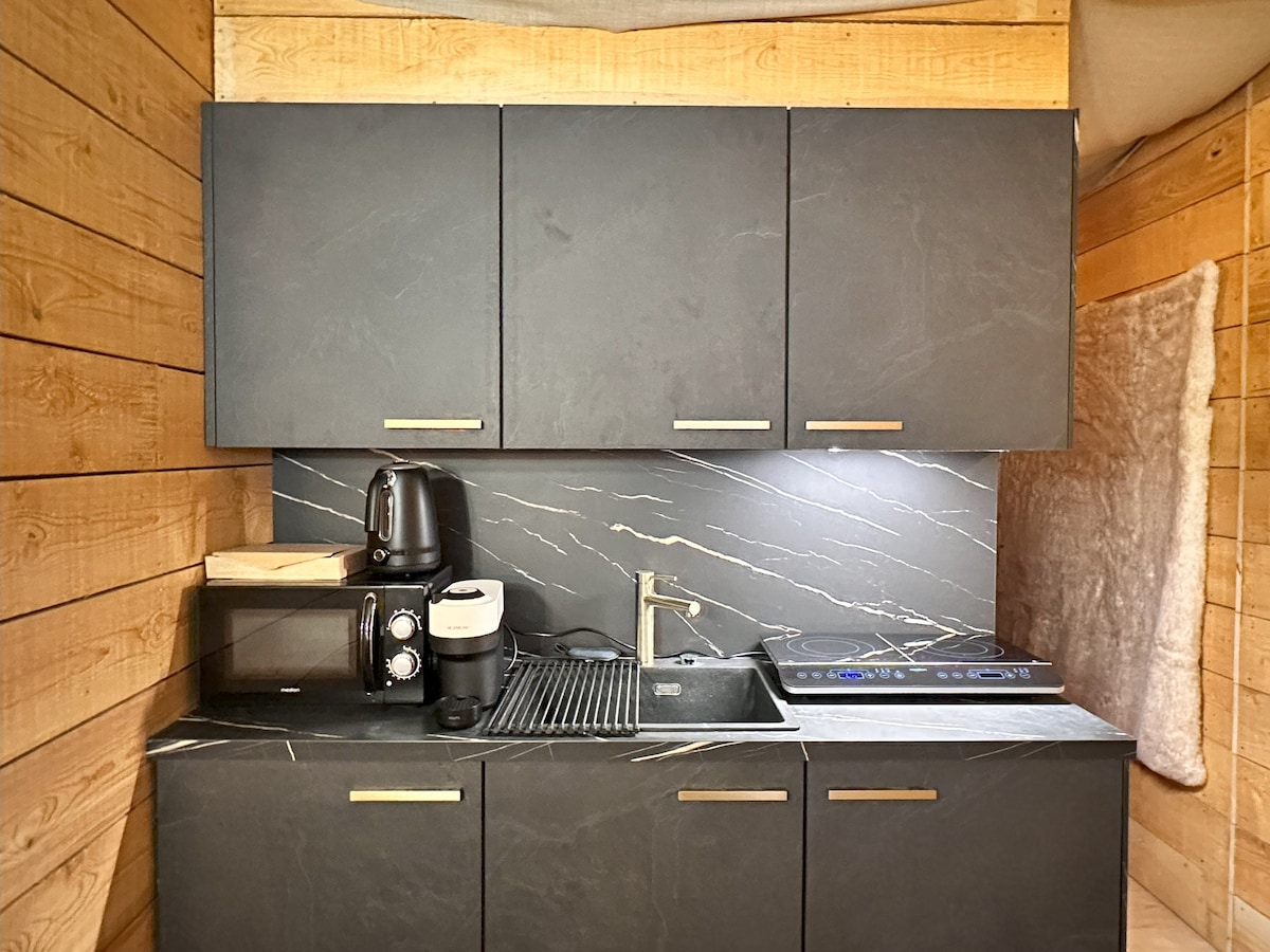 En 19 kvm TREKAPSEL,varm,med moderne komfort og alt du trenger for å føle deg som hjemme. De to terrassene, en med boblebad oppvarmet hele året til 38° , har åpen utsikt over en dal, miljøet er stille. Den finske grillen og badstuen er valgfrie. Landsbyen vår ligger mellom Besançon (15 minutter) og Jura (20 minutter), Louedalen (10 minutter) og Doubsdalen (5 minutter), og den er ideelt plassert for å stråle gjennom denne vakre regionen.