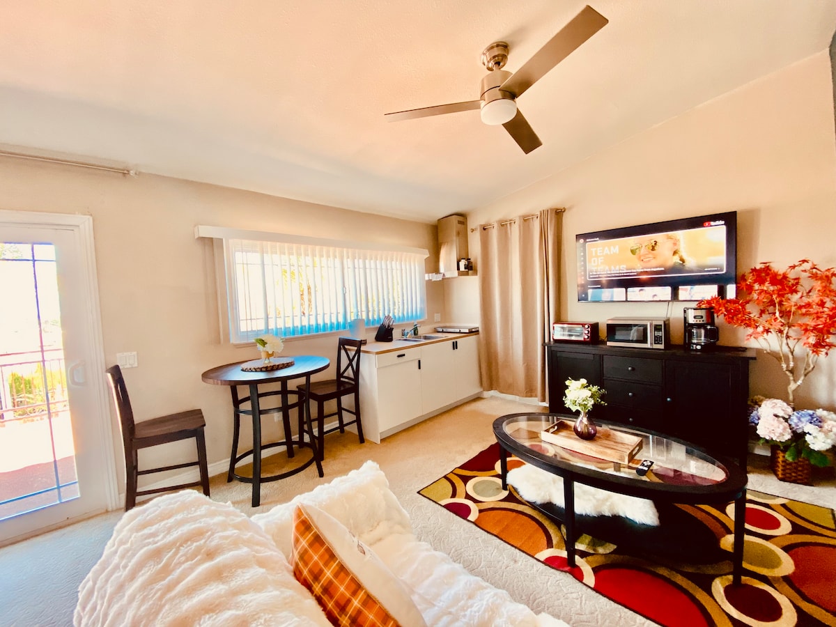 Denne stilige studioleiligheten ligger i et familievennlig nabolag og har en sentral beliggenhet i forhold til Ontario lufthavn og Convention Center, mange sykehus og kjøpesentre, og omtrent en time unna fjellene, stranden og LA. Denne studioleiligheten er utstyrt med alt du trenger! Det er et lite tekjøkken, inkludert en Keurig, varmeplate, mikrobølgeovn og minikjøleskap. Det er et lite terrasseområde for å nyte naturen, eller TV for å se favorittprogrammene dine. Du kommer garantert til å ha et avslappende opphold her!