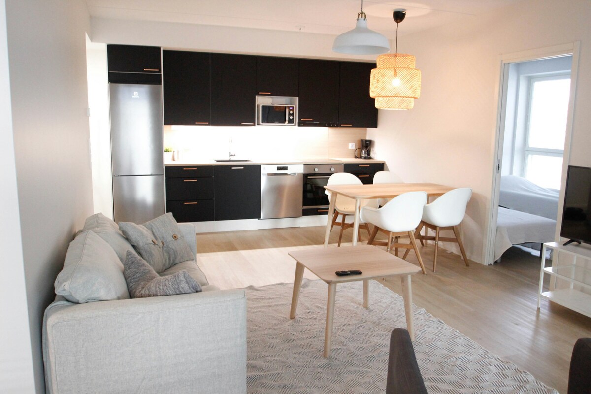 Velkommen til en luksuriøs leilighet med to soverom i sentrum av Jyväskylä, perfekt for opptil fire gjester. Nyt et fullt utstyrt kjøkken, en koselig stue og en privat sauna. Kjæledyr er velkomne. Utforsk lokale museer og restauranter i nærheten.