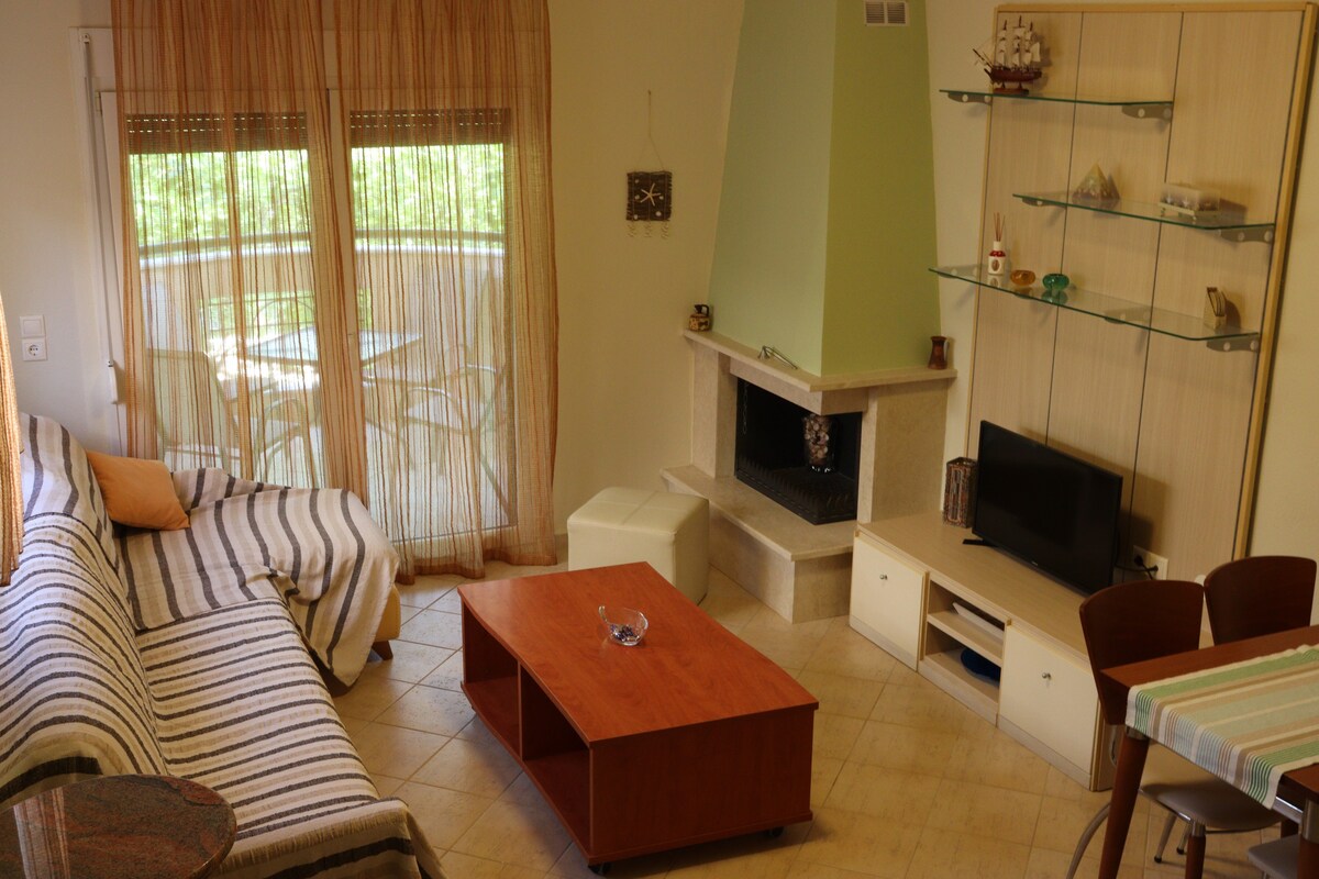 Nydelig sommerhus på Kalamitsi-stranden, den beste sommerdestinasjonen! I leiligheten er det et soverom med en stor dobbeltseng, en stue med en hjørnesofa som blir en dobbeltseng. Leiligheten er fullt utstyrt med møbler og kjøkkenutstyr. Den ligger i et utmerket område, bare 100 meter fra en strand (i Thalatta-leiren) og 400 meter fra Kalamitsi-stranden, som passer perfekt for familier og par for et fredelig opphold.