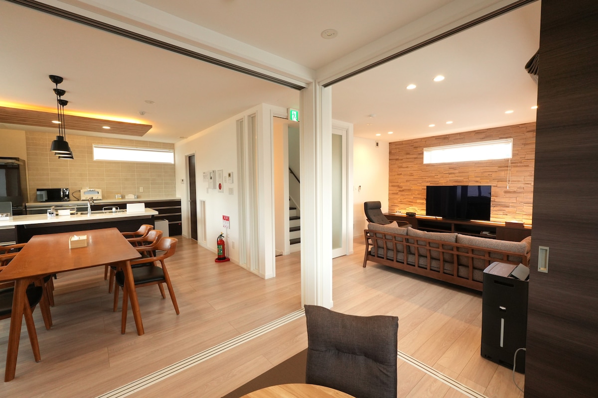 Moderne 157 kvm stort designerhjem | nær dyrehage og skianlegg 13 minutter til Asahiyama dyrehage, 20 minutter til Canmore skianlegg. Butikker og restauranter ligger innenfor gangavstand. Perfekt for familier eller grupper. Romslig hjem med en ekstra stue, to badekar og et koselig åpent område. Alle sengene har førsteklasses madrasser på 120 cm for god søvn. Soverommene har TV, klimaanlegg og luftrensere. Stilig, komfortabelt opphold for sightseeing eller lange besøk i Hokkaido.
