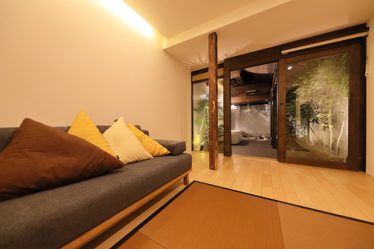Kyomachiya Private Lodging «Takasegawa Shichijo» er en fullt renovert 115 år gammel kyomachiya. Kyomachiya, som danner det vakre landskapet i Kyoto, har blitt ombygd til en bygning med høy lufttetthet og varmeisolasjon, slik at du kan tilbringe en komfortabel tid i de fuktige somrene og kalde vintrene som er unike for Kyoto, samtidig som den opprinnelige strukturen er bevart. Fra rommet i japansk stil i første etasje kan du se tsubo-hagen (en hage som fører til tesalongen) med et «roji»-bilde. I tillegg har vi forberedt en sofa i gangen, slik at du kan slappe av og nyte utsikten over tsubo-hagen. Om kvelden kan du tilbringe en avslappende stund mens du ser på den opplyste tsubo-hagen. Det er to soverom i andre etasje, ett med to enkeltsenger og ett med én dobbeltseng. Hvis det er fem eller flere gjester, kan vi forberede en futon i rommet i japansk stil i første etasje og bruke det som et soverom, selv om det er litt bry. Kjøkkenet er utstyrt med kjøkkenutstyr og servise for enkel matlaging.