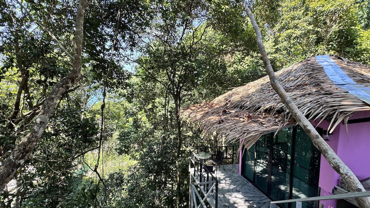 A little pink bungalow with a bamboo roof and private terrace overlooking the jungle at Buffalo Bay — tucked away in total privacy above the trees. Small, intimate, entirely yours. One of the island's longest and quietest beaches is just a climb down away. Good to Know Reaching the beach means climbing down a steep and uneven cliff path — and back up on your return. Not suitable for guests with mobility limitations.