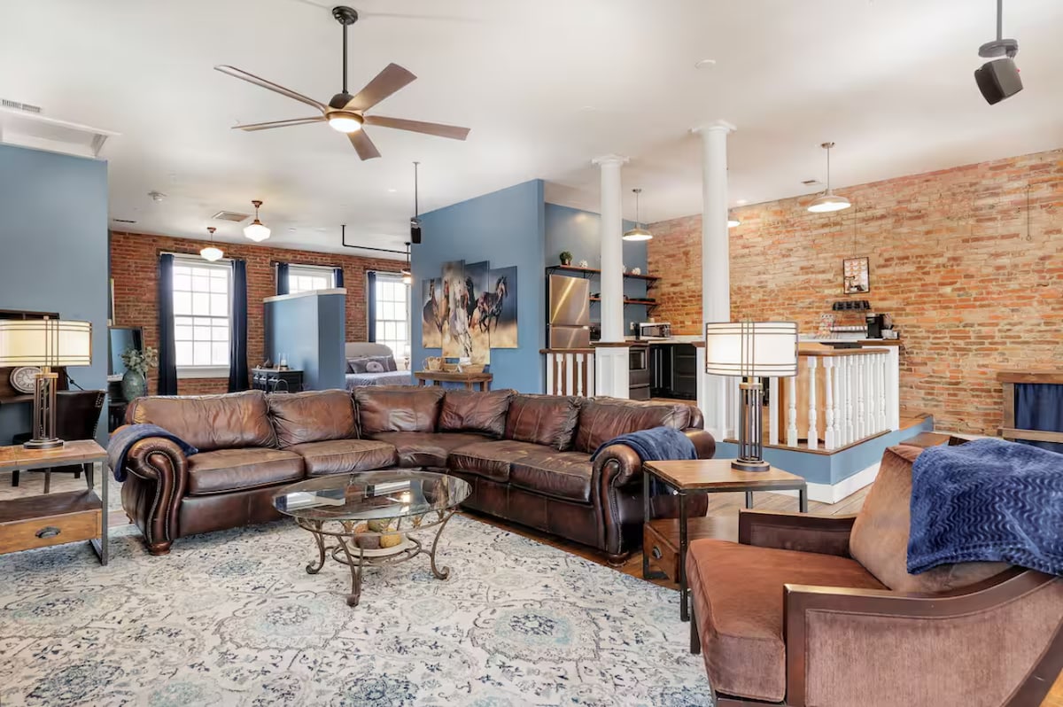 Se ut på det uberørte rådhuset med Frihetsgudinnen og en bronseskulptur som markerer byen hvor Honest Abe besøkte like før han kunngjorde sin løp for presidentskap. De opprinnelige mursteinene og løvtre i dette unike 170 år gamle hjemmet har stått ved tidens prøve. Ta en heis (eller trapp) til andre etasje. Beliggenhet i hjertet av det historiske sentrum av Leavenworth, den første byen i Kansas. Innenfor noen kvartaler er det flere kaffebarer, bakerier, butikker og barer. Ligger bare 16 km fra den prisbelønte turistbyen Weston, som har mange bryggerier, vingårder og turstier. Du finner ikke dette noe annet sted! Opprinnelige brede tregulv som ble lagt for 165 år siden, og de opprinnelige mursteinsveggene som har stått testen. En utsikt fra ni vinduer med utsikt over det uberørte rådhuset vårt med frihetsgudinnen og statuen av Abraham Lincoln. (Lincoln annonserte sin løp for presidentskap rett der i Leavenworth!) Og tenk, han gikk sannsynligvis over gaten og kom inn i bygningen vår, siden det var en salong på det tidspunktet! Du kommer inn på loftet vårt fra gaten med tastaturlås, og det er et lite rom som fører til vår nye heis (stor ståldør) for å ta deg til 2. etasje. Veibeskrivelse til heisen er på veggen. Veldig enkelt, bare lukk den hvite døren til heisen i tilfelle festen din kaller det fra en annen etasje. Festen din er de eneste som har tilgang til denne heisen. Innsjekking er mellom kl. 16.00 og 19.00. Send oss en tekstmelding hvis det ikke er innenfor den tidsrammen. Utsjekking er kl. 11.00. Igjen, send oss en tekstmelding hvis du trenger mer tid! Mac og Stacy er alltid kun en tekstmelding unna og kan være der innen ti minutter. #913-651-7798. Send oss en melding med eventuelle spørsmål! Kjør en egendefinert heis til det åpne, men koselige stedet over vertens stearinlys og gavebutikk. Leiligheten er en flott base for å utforske KC, Fort Leavenworth, fylkesstedet og sjarmerende Weston i Missouri. Butikker, restauranter, kafeer og barer ligger få skritt unna. Det er en stor parkeringsplass bak bygningen i 5th street. 65" TV, men vi har ikke kabel. Det er en DVD-spiller, og du er velkommen til å koble telefonen til TV-en for å se din beste video, hulu osv. Det er det vi gjør, og vi bruker dataene fra telefonen eller datamaskinen til å vises på TV-skjermen!