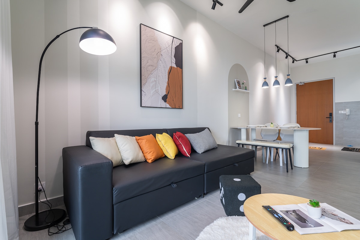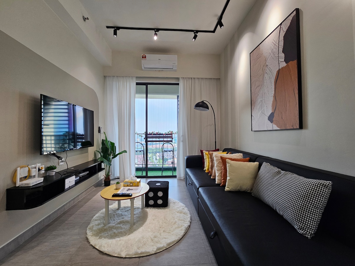 Chemong's Suites @ Renai Jelutong tilbyr et rolig Wabi-Sabi-inspirert opphold med minimalistisk eleganse og ultimat komfort. Slapp av med en Gintell massasjestol, nyt fantastisk utsikt over golfbanen og byen, og nyt førsteklasses fasiliteter – evighetsbasseng, sauna, jacuzzi, grillplass og takterrasse. Ligger i nærheten av LRT, KTM og store motorveier, med høyhastighets WiFi, gratis Netflix og et komplett kjøkken. Perfekt for familier og forretningsreisende som søker en luksuriøs, men fredelig flukt i Shah Alam!