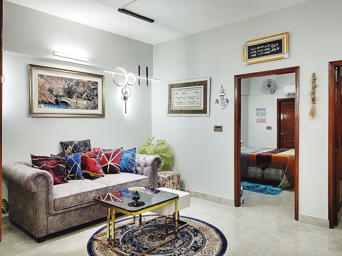 🛏️ Premium leilighet med tre soverom og tre bad 🎨 Koselig, stilig interiør med myke senger for dyp, lykkelig søvn 💤 🛋️ Stilig TV-stue med hvilestoler – Netflix og Chill 🍿 👩👩👧👦 barnevennlig og familiekomfortabel, men likevel ideell for 👤 alenereisende eller 💼 forretningsreisende 🍳 Fullt utstyrt kjøkken, ⚡raskt trådløst nettverk, ❄️ varme og kjølige klimaanlegg 🌿 to balkonger for frisk luft 🌊 8 minutter til Sea View, 🛍️ 12 minutter til Dolmen Mall Clifton 📍 2. etasje, DHA Phase VI, Kh-e-Bukhari – førsteklasses beliggenhet, stressfritt opphold✨
