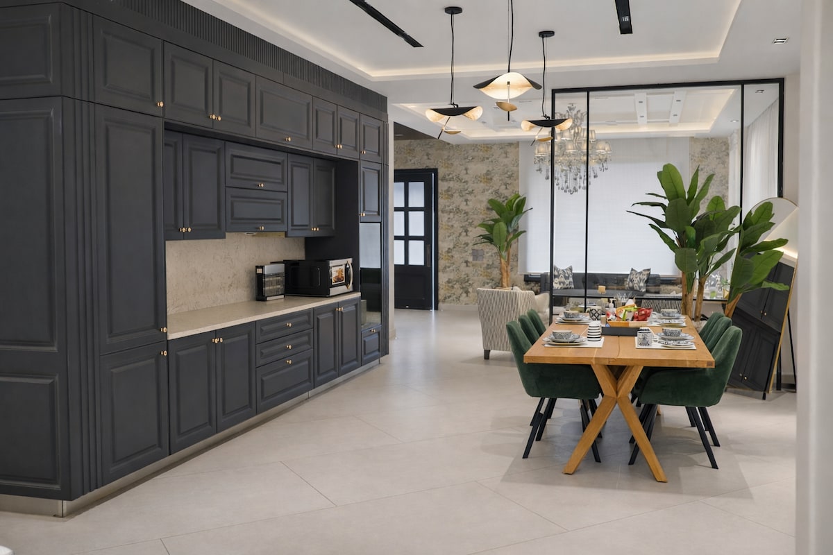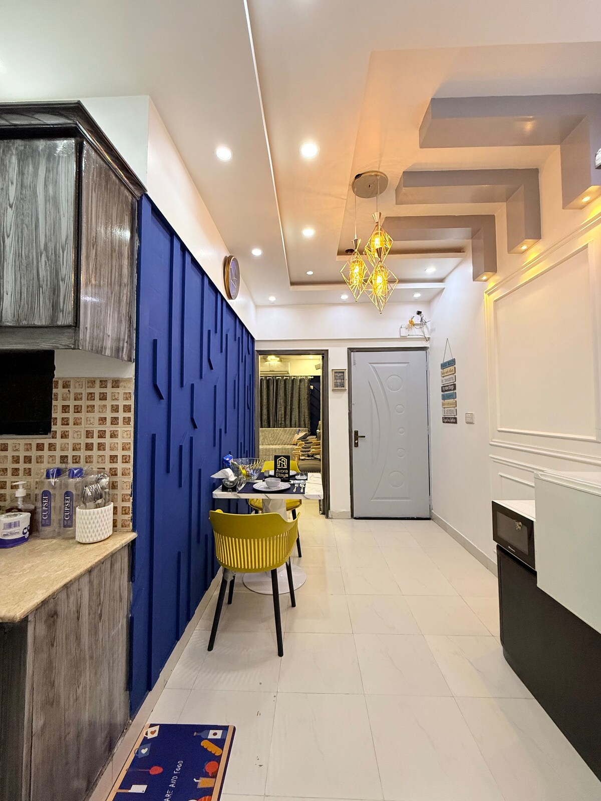 Nyt denne lyse, fargerike studioleiligheten i en ny bygning i DHA Phase VI (Small Bukhari) i andre etasje (uten heis). Se Netflix og YouTube på smartprojektoren i sengen🎥, eller gled deg over filmer med LED i stuen📺. Slapp av på fløyelssofaen💺, lag mat på det moderne kjøkkenet 🍳og spis under buelampen ved siden av et nydelig maleri🎨. To 🚿 bad betyr ingen venting. Moderne, stilig og superkomfortabelt ✨