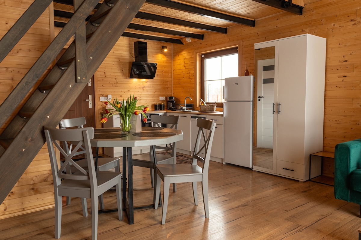 Basen er 3, fullt utstyrte hus med et areal på 50 m2 + lukkede mezzaniner. Første etasje i hvert hjem er en stue med en tekjøkken og en 18 meter lang terrasse, et soverom med en dobbeltseng og et bad. Det er to enkeltsenger på mezzaninene. Det optimale antall gjester i huset er 4 personer, en sovesofa i stuen kan gi overnatting for 2 ekstra personer. Tlen er et tilfluktssted året rundt. Om vinteren, oppvarmet, luftkondisjonert om sommeren For hvile og ro.