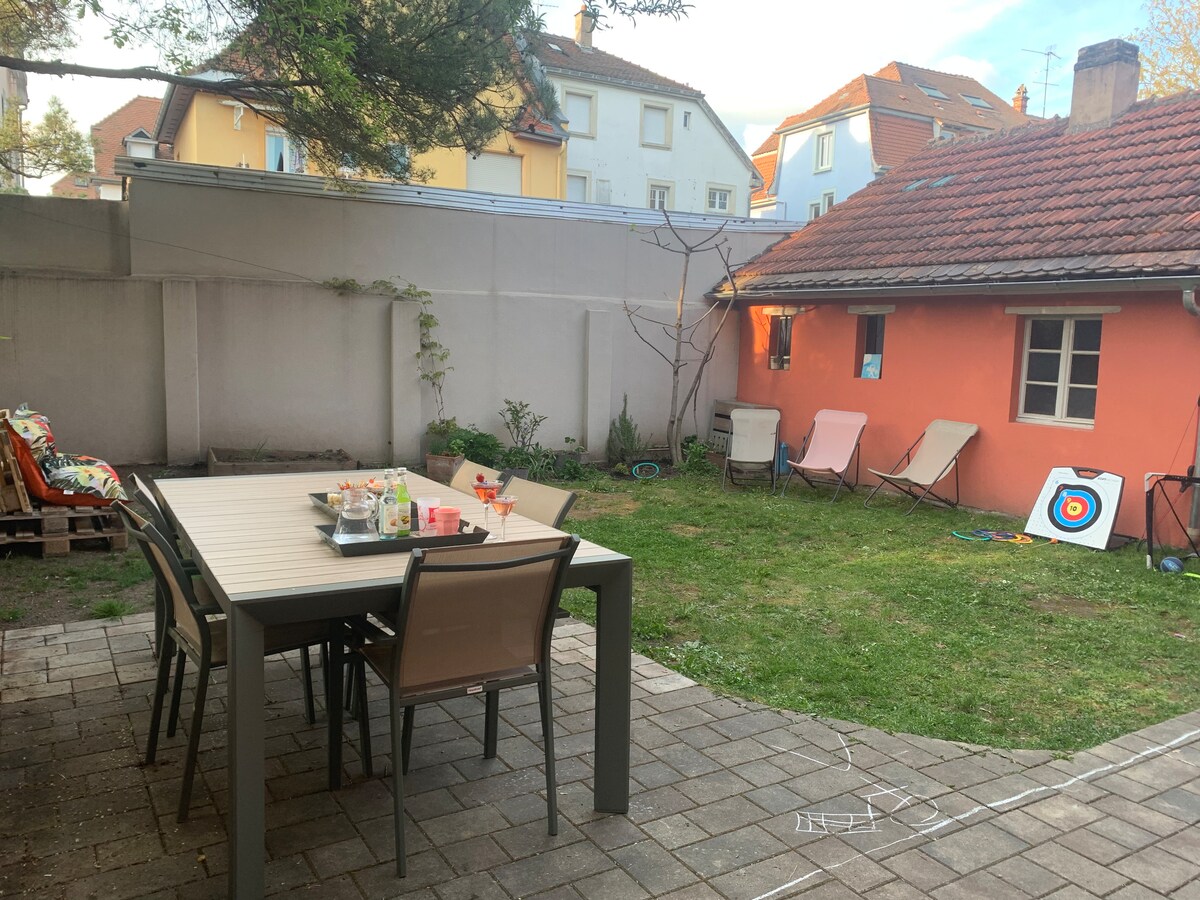 Sjarmerende leilighetsrekkehus på 46 m2 renovert av arkitekten, beliggende i nærheten av togstasjonen og sentrum i en indre gårdsplass med separat inngang. Overnattingsstedet er egnet for korte eller lange opphold, og er koselig og komfortabelt. Nær alle fasiliteter, i et dynamisk nabolag. Restauranter, barer, museer, kinoer, markeder, butikker, trikk, hyper-senter og Petite France innen 5 minutters gange.